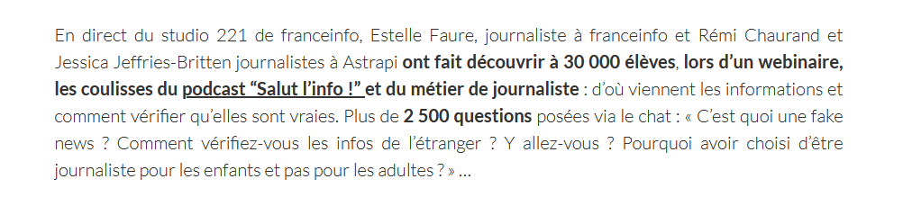Bien s’informer ça s’apprend ! : 40 000 élèves ont assisté aux « lives » avec nos journalistes Salut l’info ! Le direct : “Bien s’informer, ça s’apprend !” Salut l’info ! Le direct : “Bien s’informer, ça s’apprend !”