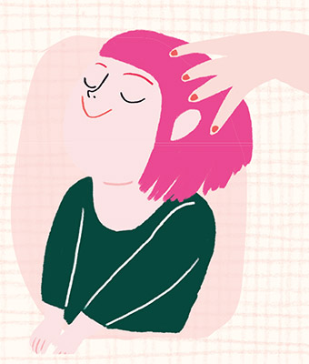 On frotte ses mains l’une contre l’autre pour qu’elles se réchauffent. On masse chaque doigt délicatement. On fait une caresse à son front, ses tempes, ses joues. Puis à partir de son menton, on caresse son cou jusqu’à la nuque, en passant par les oreilles. Et on remonte dans le cuir chevelu en appuyant un peu plus fort.