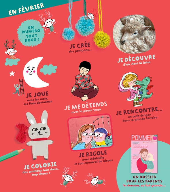 “La douceur fait grandir”, supplément pour les parents du magazine Pomme d’Api n° 636, février 2019. Texte : Isabelle Vial, illustrations : Kei Lam.