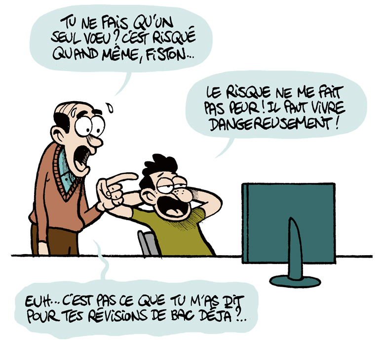 Jusqu’en 2017 sur APB, les élèves devaient formuler au moins un vœu dans une filière non sélective (exemple : une licence en fac). Depuis l’arrivée de Parcoursup, cette injonction est supprimée, afin que les volontés des candidats soient vraiment respectées. Attention ! L’année passée, certains, un peu trop ambitieux, se sont montrés si sélectifs que tous leurs souhaits ont été refusés. Alors, nous vous conseillons d’identifier des formations non sélectives à la fac… si, d’aventure, tous vos choix sélectifs étaient retoqués. Par exemple, si vous visez une prépa économique, sachez que les licences AES (Administration économique et sociale) ou Économie-gestion vous permettent d’étudier des disciplines similaires à celles d’une CPGE. Vous pourrez ensuite tenter d’intégrer des écoles de commerce via les admissions parallèles.