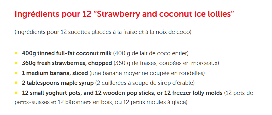 Des sucettes glacées à la fraise et à la noix de coco… : voici un goûter très frais, parfait pour l’été ! Les enfants peuvent préparer seuls cette recette du magazine I Love English for Kids (8-11 ans). En anglais et en français, elle leur permettra d’enrichir leur vocabulaire en s’amusant ! Enjoy!